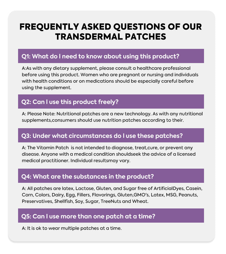 Onze patches zijn ontwikkeld als voedingssupplement en bevatten zorgvuldig geselecteerde ingrediënten. Zoals bij elk supplement is het belangrijk de ingrediëntenlijst te controleren voordat je het product gebruikt. Bij twijfel of specifieke gezondheidsvragen adviseren wij een deskundige te raadplegen.